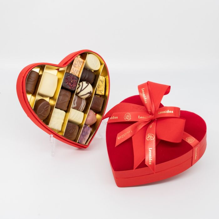 Ca. 230 Gramm der beliebtesten Sorten von Leonidas ausgewählt (ohne Alkohol), in einem hochwertigem Satin Samt Herz als Geschenk verpackt.