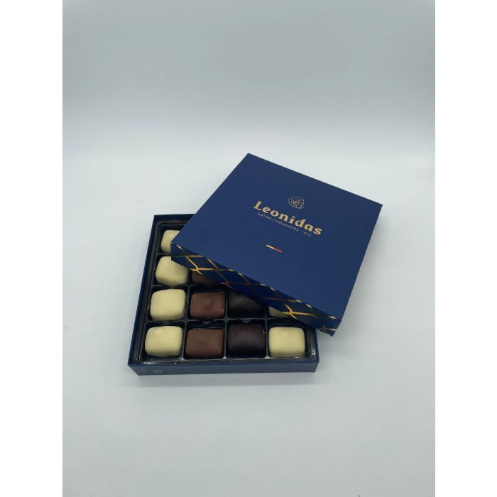 Eine Kollektion von 16 Manon Café Pralinen mit ganzer Haselnuss (ohne Alkohol), in unserer hochwertigen Leonidas Präsentbox.